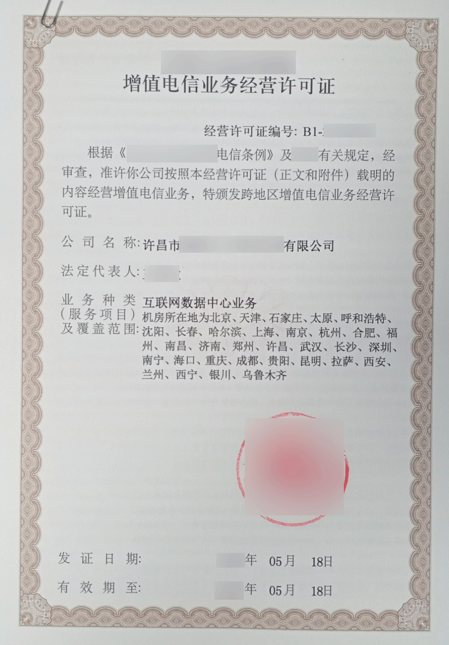 资质全称:第一类增值电信业务许可证-互联网数据中心业务