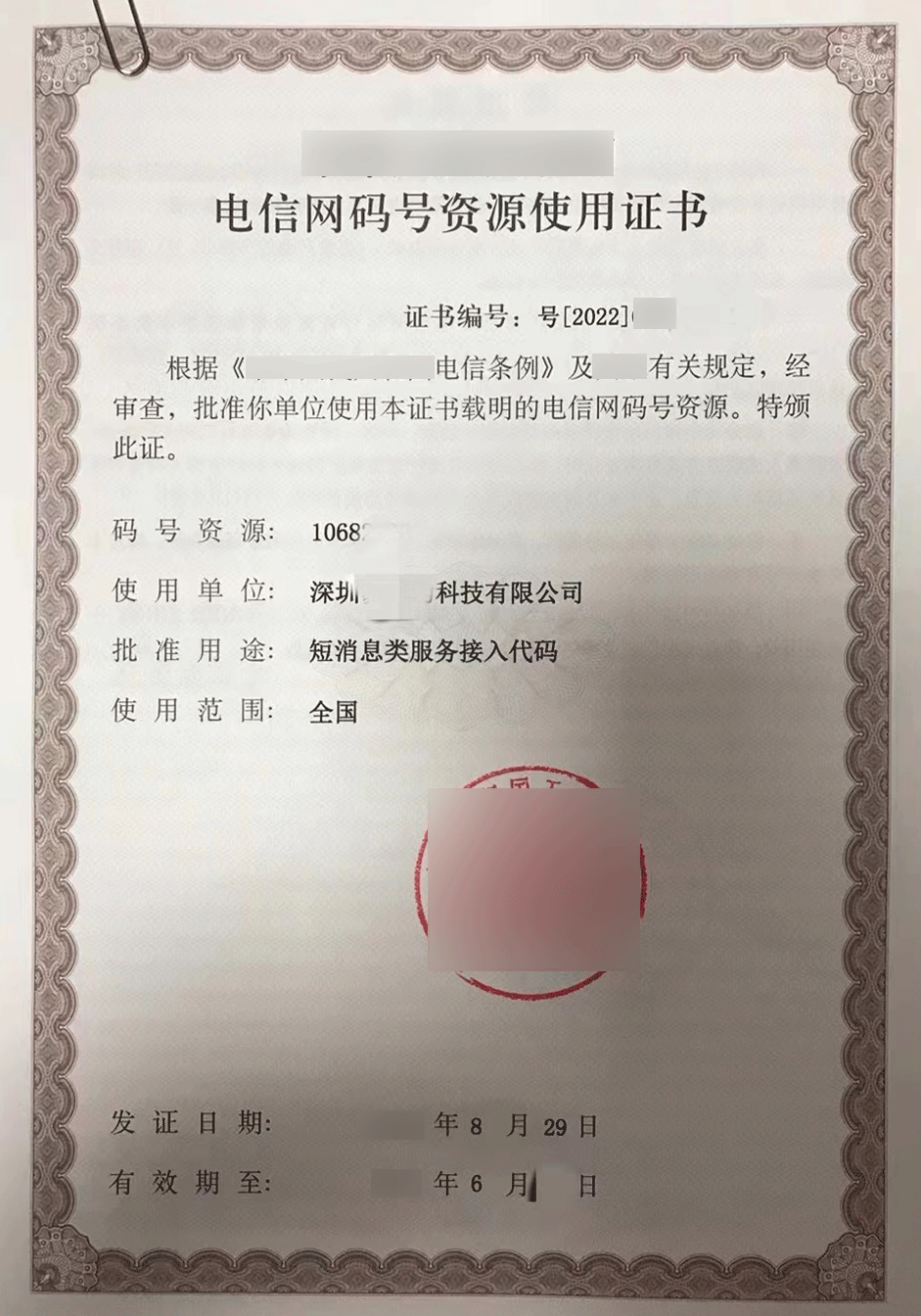 • 资质全称:电信网码号资源使用证书-短消息类服务接入代码